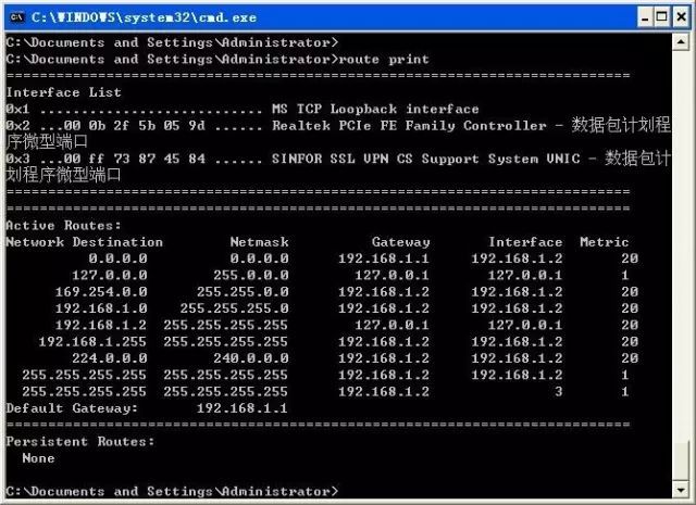 route print命令用于显示路由表中的当前项目,在单个路由器网段上的输出结果如图所示。
