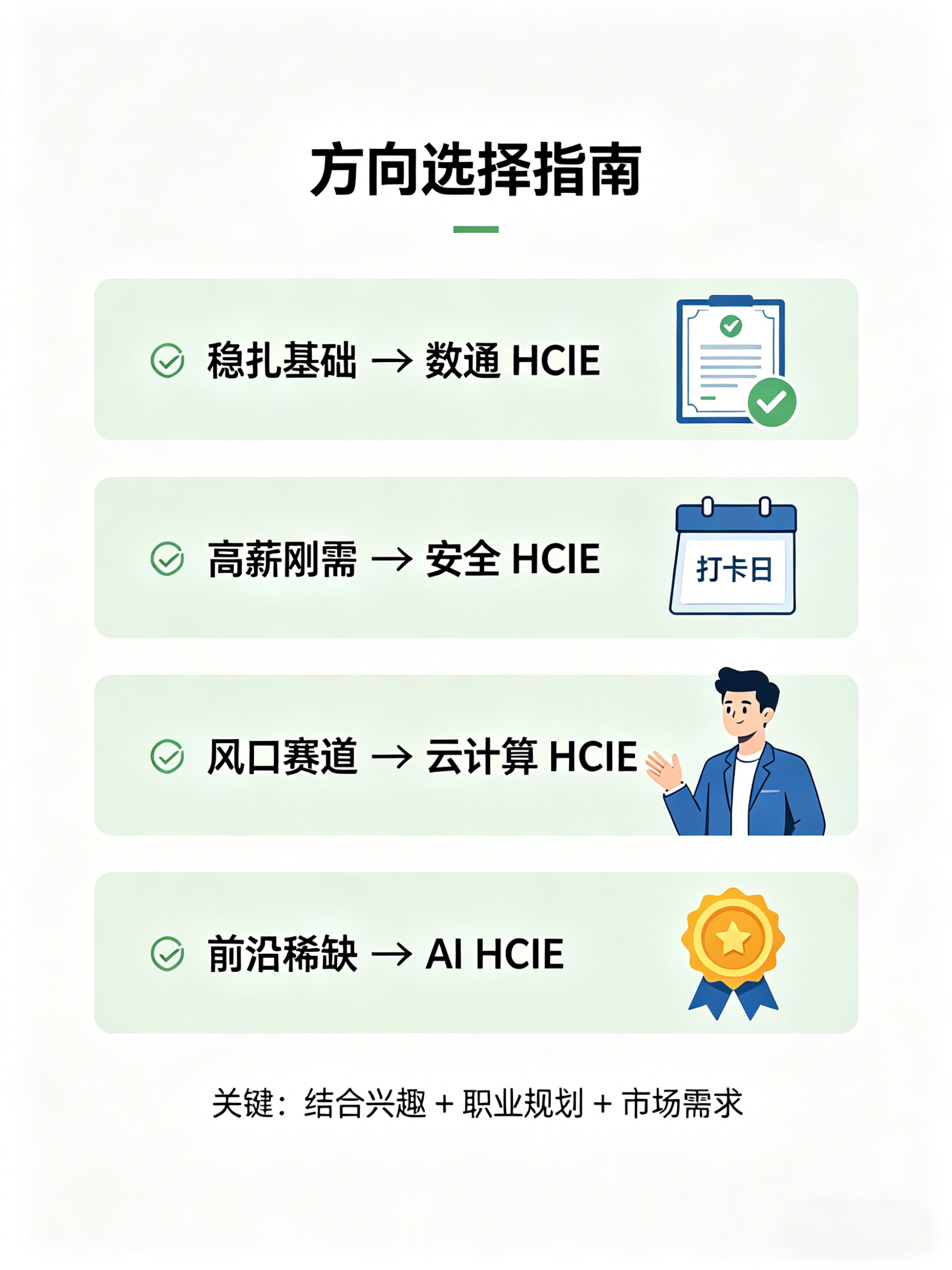 华为官方在认证体系介绍中也一直强调,HCIE的目标是培养具备规划、设计、实施、运维和优化能力的专家型人才。换句话说,方向选得准,比单纯追求“先拿一个HCIE”更重要,因为HCIE本来就是按技术场景来划分的。