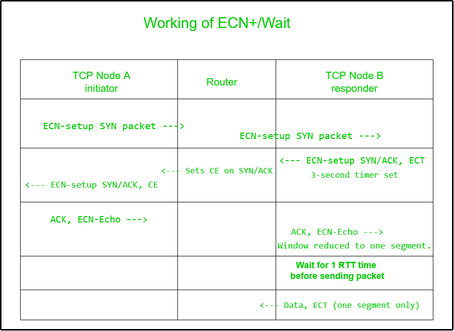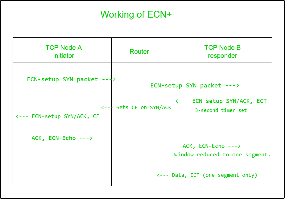 它实际上是ECN+的扩展版本。适用于轻度到中度的拥塞情况。SYN/ACK数据包可以在IP头部携带ECT(0)或ECT(1)的值。这意味着,如果存在拥塞情况,路由器可以标记这些SYN/ACK数据包。ECN+是一种服务器端机制。
