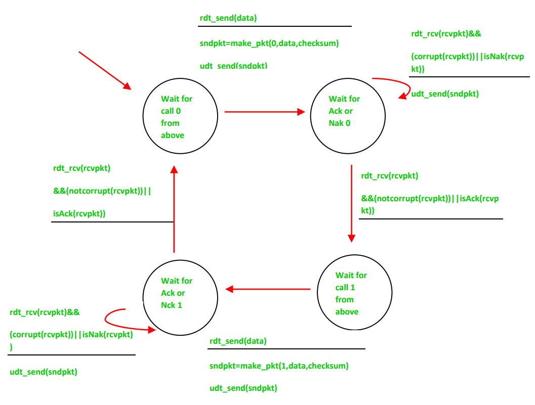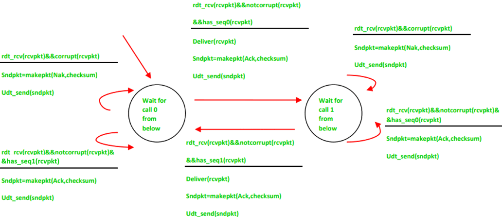 国家2(正确做法):如果它接收到损坏的数据包,那么它会发送否定确认,以请求重新发送该数据包。否则,如果它接收到序列号为‘0’的未损坏的数据包,那么它就会发送肯定确认。同样地,如果它接收到序列号为‘1’的未损坏的数据包,那么它就会进入下一个状态。