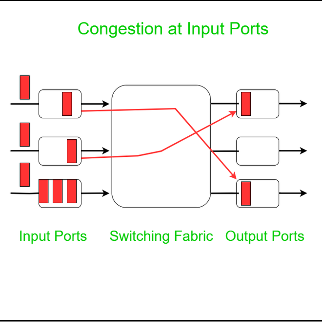 假设该路由器有 N 个输入端口和 N 个输出端口。 如果交换 fabrics 的速度小于数据包到达输入端口速度的五次方,那么就会发生拥塞现象。 假设在某一单位时间内,有1个数据包被发送到每个输入端口。 在一个单位时间内,有N个数据包到达输入端口。 切换网络的速度远远低于每单位时间能够处理的N个数据包的数量,因此,这些到达输入端口的数据包将无法被转发到输出端口。 也就是说,交换结构会处理N/2个数据包,而剩下的N/2个数据包则被排队在输入端口中。 如果这些数据包持续不断地到达输入端口,那么很快,输入端口的缓冲区就会充满,从而导致拥塞状态的出现。此时,数据包就会被丢弃。