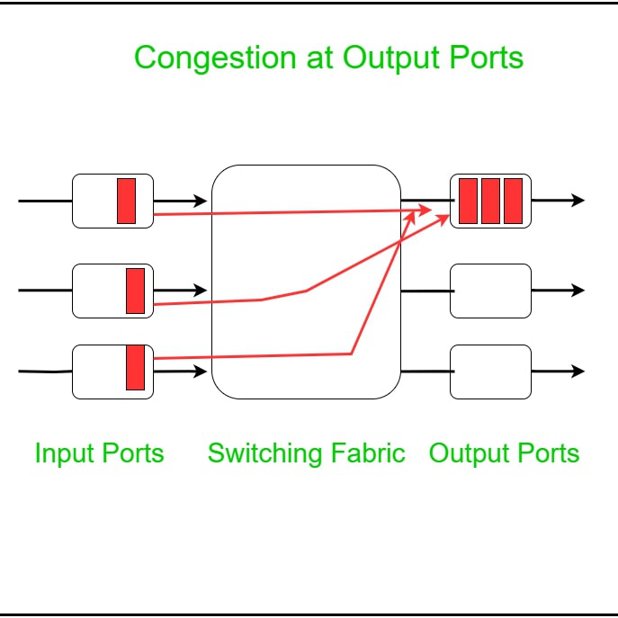 拥塞现象发生在数据包的到达速率大于数据包的转发速度时。路由器具有输入端口和输出端口,因此,拥塞可能发生在任何端口上,具体取决于交换结构的传输速度。