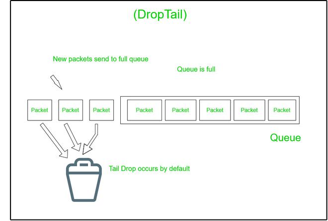 它会将数据包从队列的“尾部”移除。当队列已满且仍有数据包不断到达时,这些新到达的数据包就会被丢弃,因为队列中已经没有空间可以容纳它们了。由于数据包是从队列的尾部被移除的,因此这种机制被称为“Drop Tail”。它的运作方式类似于一个简单的FIFO队列:先到达的数据包会被放入队列中,而后来到达的数据包则会被丢弃。