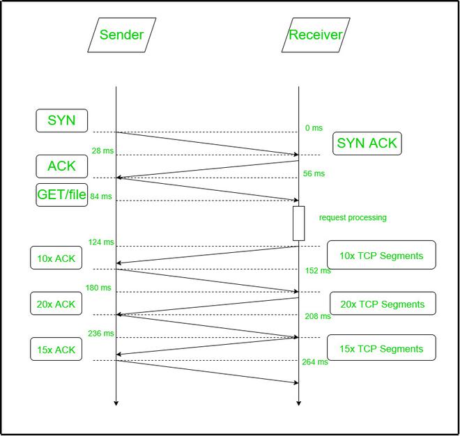 264 毫秒 taken by the server to successfully(with ACK) send 45 segments to the client. By formula time taken by Slow Start to grow the cwnd to 64 KB = 168 毫秒. Server processing time = 40毫秒 Time elapsed in 3-way Handshakes =56毫秒 总时间 = 3-way-handshake + server_processing + Slow_start 264 = 56(3-way-handshake) + 40(server response time) + 168(Slow_start) ms Thus, slow start and 3-way Handshakes have wasted = 168 ms + 56 ms = 224毫秒.