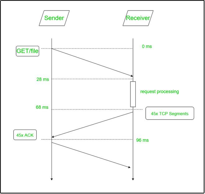 步骤4:现在,发送方在时间56毫秒时向接收方发送GET请求。该请求需要28毫秒才能到达接收方,之后接收方就能收到这个GET请求了。