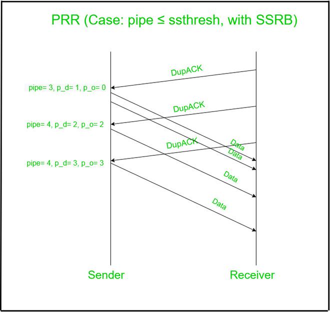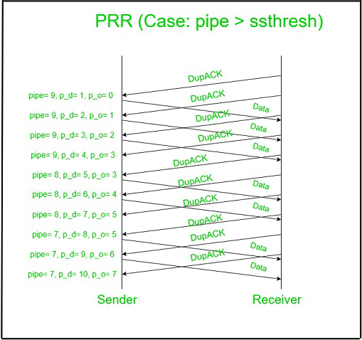 当恢复阶段开始时,管道值会大于cwnd。但是,也有可能出现这种情况:由于SACK机制的原因,数据包丢失了,此时管道值就会小于cwnd。PRR算法会针对这些不同的情况采取不同的处理方式。