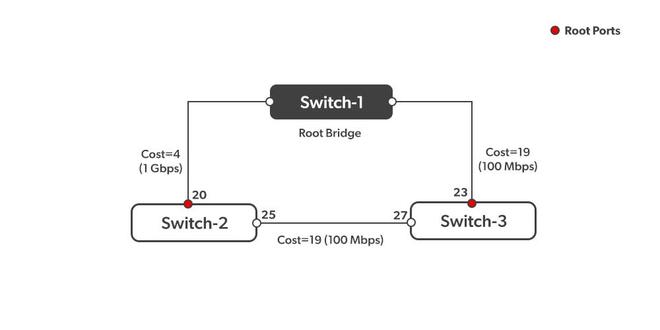 在图1中,有两条非根桥(即交换机2和交换机3)。每条桥都应该有一个根端口。根端口的选择是基于成本来决定的。