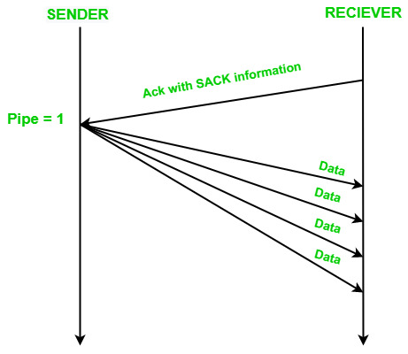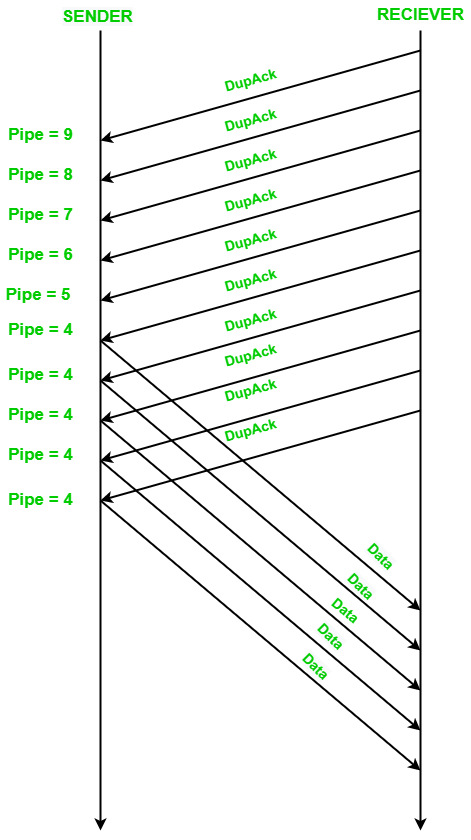 - DUP-ACK到达发送方时,其值为:pipe=5-1=4,且pipe<cwnd。此时,发送方会发送一个新的数据包,其值为:pipe=4+1=5。
