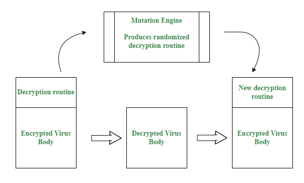 - 当被感染的程序被执行时,病毒的解密程序会控制计算机,从而解压出病毒体以及变异引擎。之后,控制权会被转移给病毒本身,而病毒会寻找一个新的目标来感染。