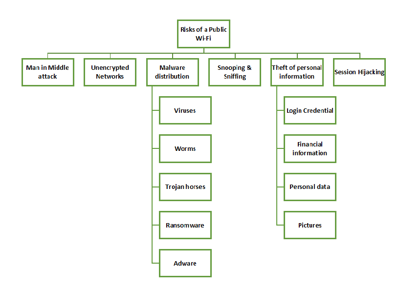 - 恶意软件感染:黑客可以利用公共Wi-Fi来实施某些目的。恶意软件如果您的设备没有采取保护措施,那么在连接到被攻击的网络时,您的电脑或智能手机就有可能被恶意软件感染。