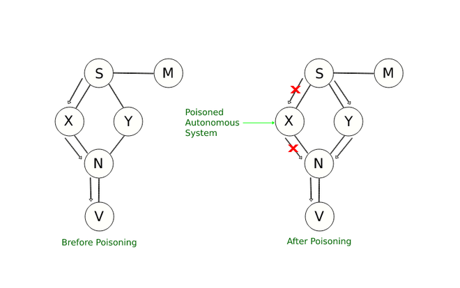 BGP中毒的工作原理如上述图片所示,显示器M所观察到的路径为:(S X N V) p) 以由自治系统V所指定的前缀“p”的方向前进。 为了找到从自治系统S出发,朝向p方向的其他路径,我们可以通过声明(V X V)来使自治系统X失效。 p)。 现在,循环阻止机制将会启动,从而将从自治系统X到自治系统V的路径移除。这样一来,自治系统S就会选择另一条通往前缀p的路径,即(S Y N V)。 p)。