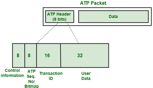 一个ATP数据包由ATP头部和数据部分组成。ATP头部的大小为8字节。整个数据包被封装在DDP(数据报传输协议)的数据报中,并以数据链路层帧的形式进行传输。