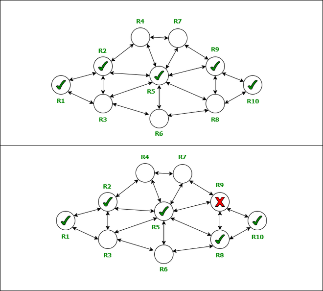 在上图中,上部分展示了从R1到R2、再到R5、R9、R10的路径,这些路径用于传输数据。R1(来源)到R10(目的地),但是,由于某些原因……R9如果无法处理当前的工作,那么系统会动态构建一条新的路径,这条新路径为 R1→R2→R5→R8→R10。