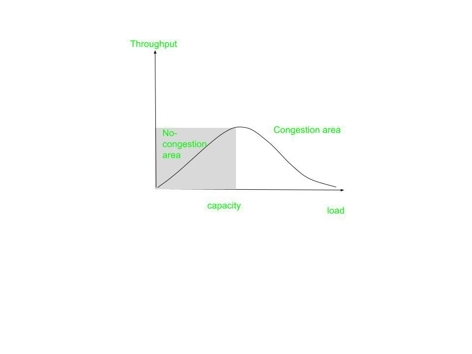 基于整个过程中当负载低于网络的承载能力时,吞吐量会随着负载的增加而成比例地上升。 我们预计,在负载达到容量之后,吞吐量会保持恒定。但实际上,吞吐量会急剧下降。 原因在于路由器会丢弃这些数据包。 当负载超过路由器的处理能力时,队列就会变得满员,此时路由器不得不丢弃一些数据包。不过,丢弃数据包并不会减少网络中的数据包数量,因为当数据包无法到达目的地时,发送方会重新发送这些数据包,同时也会使用超时机制来处理这种情况。
