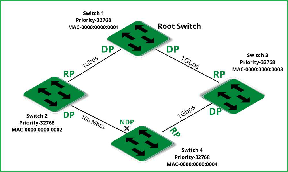 - 如果局域网段的一端是“指定端口”,那么另一端则被称为“非指定端口”(标记为NDP),除非该端口也是“根端口”。