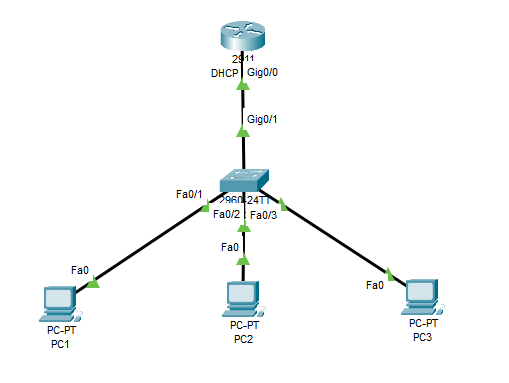 在Cisco Packet Tracer中,可以创建一个网络拓扑结构。该结构中包含一台路由器、一台交换机,以及三个连接到网络的主机系统。