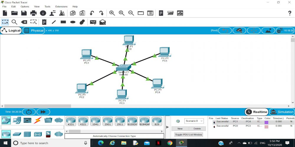 Cisco Packet Tracer是一种用于理解网络的仿真工具。Cisco Packet Tracer最出色的地方在于其可视化功能——用户可以清晰地看到消息的传输过程,从而了解网络设备的运作方式。使用Cisco Packet Tracer来构建星型拓扑结构时,所使用的设备就是交换机。