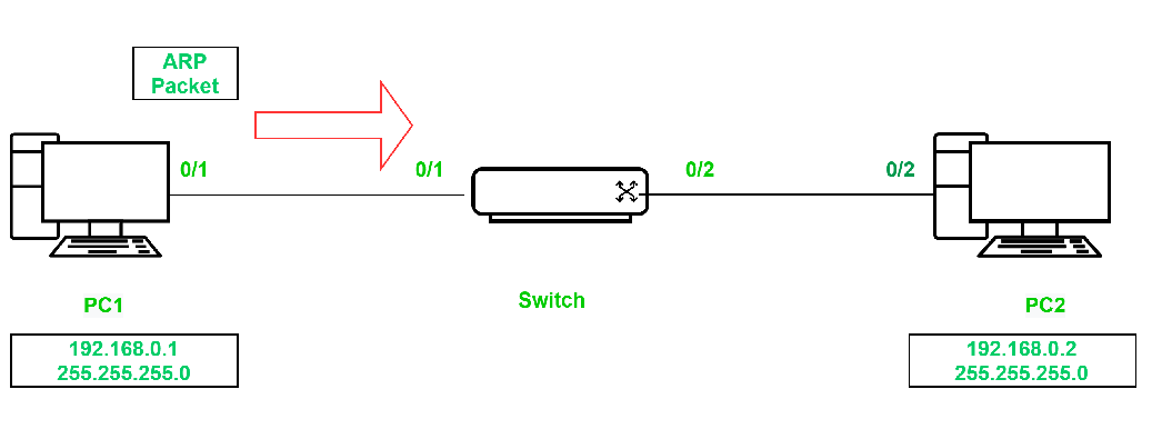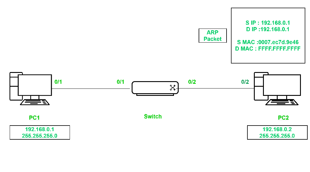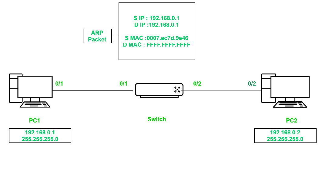 假设,分配IP地址192.168.0.1 255.255.255.0发送到PC1。系统会立即生成一个ARP数据包,该数据包的广播目标MAC地址为PC1的MAC地址。FFFF.FFFF.FFFF以及具有自己IP地址的目地IP地址192.168.0.1.