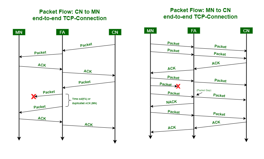 - 在从移动节点向代理节点传输数据的过程中,如果外部代理检测到有数据包丢失,它会向移动节点发送NACK信号。此时,移动节点可以立即重新传输丢失的数据包。在代理节点上,数据包的排序工作由TCP自动完成。