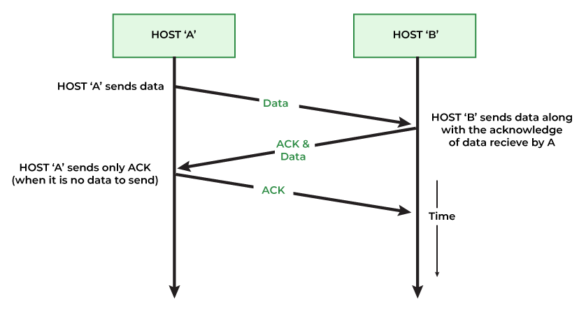 “Piggybacking”是一种技术,即接收方会延迟发送确认消息,而是将其附加到下一个要发送的数据包中。这样就能减少需要发送的独立控制帧的数量,从而提高网络的效率。