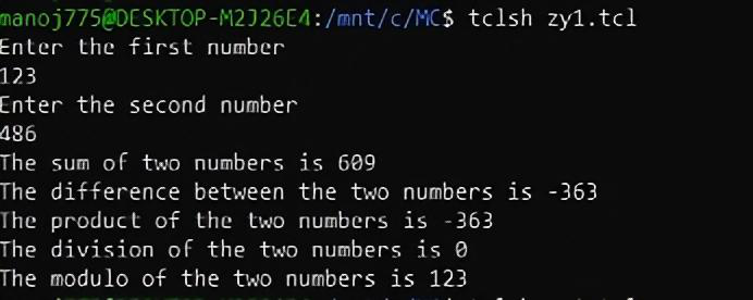 puts "The sum of two numbers is [addnumbers $a $b]"puts "The difference between the two numbers is [subnumbers $a $b]"puts "The product of the two numbers is [subnumbers $a $b]"puts "The division of the two numbers is [divnumbers $a $b]"puts "The modulo of the two numbers is [modnumbers $a $b]"