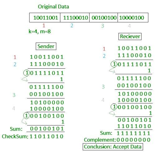 - 接收方执行相同的计算,然后将计算结果与传输过来的校验和进行比较。