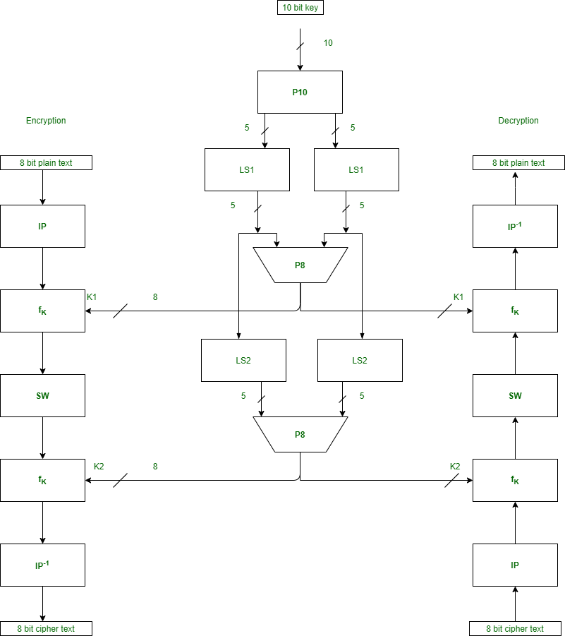 首先,我们需要在加密之前生成两个密钥。生成了这些密钥之后, chúng sẽ被传递到每个单独的轮次中,以进行 s-des 加密操作。下图展示了 s-des 算法中的各个步骤。
