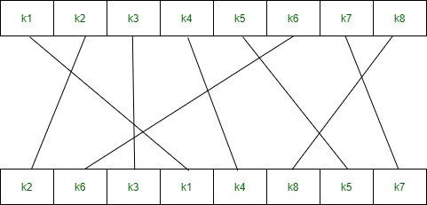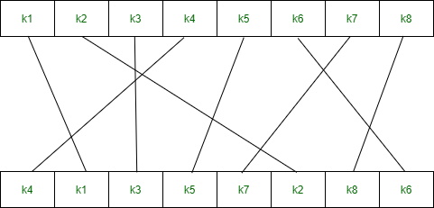 IP-1(k1, k2, k3, k4, k5, k6, k7, k8) = (k4, k1, k3, k5, k7, k2, k8, k6)