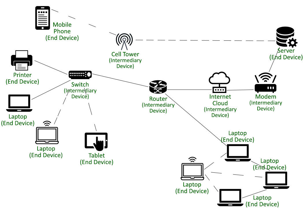 一些中间设备的例子包括集线器、交换机、无线接入点,以及用于访问网络、文件服务器、Web服务器、打印服务器的其他设备。此外,还有调制解调器,以及用于实现网络互联的各种设备,如路由器、网桥、中继器、安全防火墙等。