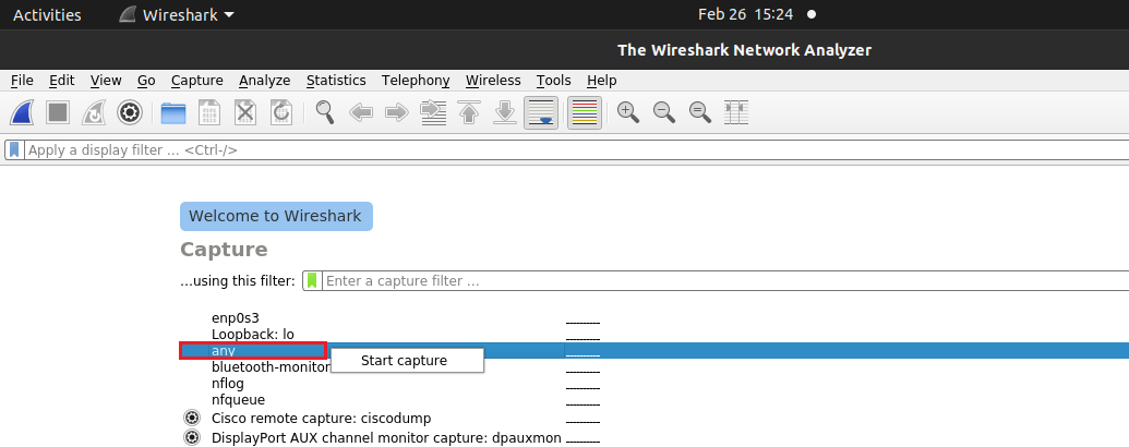 - 在打开Wireshark之后,只需双击即可使用它。任何或者点击一下即可。任何右键点击后,选择相应的选项。开始捕获。