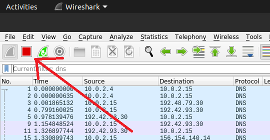 - 现在,请进入服务器虚拟机,通过点击面板左上角的红色按钮来停止Wireshark的捕获功能。这样就能停止Wireshark的捕获了。