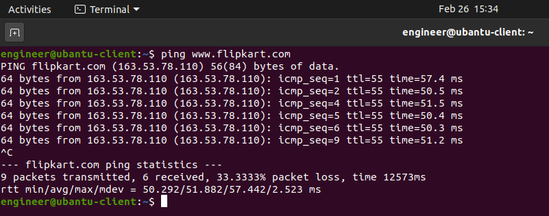 - 现在,请快速切换到客户端虚拟机中,打开终端,然后尝试访问任何网站进行测试,比如,可以试试访问这样的网站:pingwww.flipkart.com