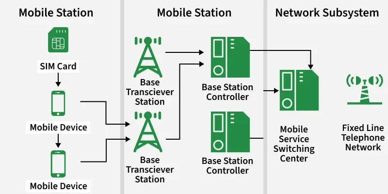 GSM(全球移动通信系统)是一种2G数字蜂窝通信技术,其诞生是为了改进传统的模拟移动通信系统。这种技术能够提供高质量的语音通话服务,同时还能支持一些有限的数据服务,比如短信服务。GSM主要使用900 MHz和1800 MHz频段进行通信,并且采用TDMA技术来为多个用户分配频道。
