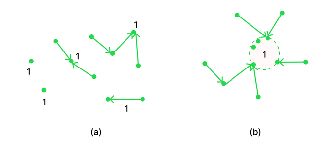 拓扑学:常规的距离向量路由和链路状态路由方式可以生成任意播送的路由,因为对于任意播送来说,不需要设计新的路由方案。假设我们希望将消息发送给组1中的成员们。那么,这些成员将会被分配地址“1”,而不是其他不同的地址。距离向量路由像往常一样,系统会分配向量。而节点则会选择前往目的地1的最短路径。这样一来,节点们就会将消息发送到距离目的地1最近的那个实例上。也就是说,系统认为节点1的所有实例都指的是同一个节点而已。拓扑学如图所示。