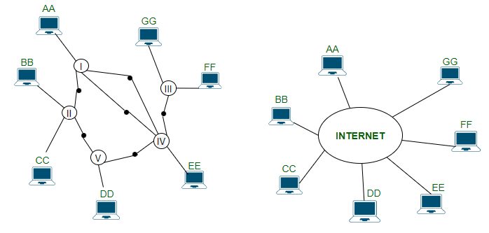 - 那些主机是以AA、BB、CC等字母来启动的。而实心圆圈数字则分别表示1、2、3。路由器那些包含罗马数字的较大椭圆形结构,其实属于独立的物理网络。