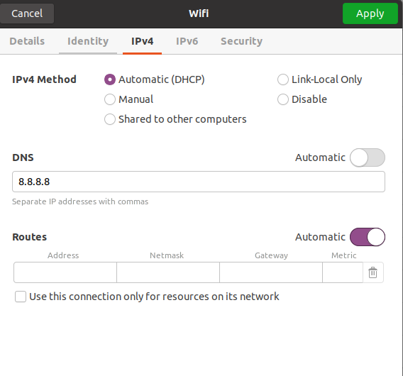 在 Ubuntu 系统中更改 DNS 设置:打开WiFi设置,然后选择与你的WiFi网络相对应的设置选项。接着进入“IPV4”页面,禁用自动DNS功能。输入你的DNS服务器IP地址,然后点击“应用”按钮。