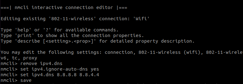 $ nmcli connection edit <your wifi ssid> nmcli > remove ipv4.dns nmcli > set ipv4.ignore-auto-dns yes nmcli > set ipv4.dns <your DNS Server Ip Address or Addresses> nmcli > save nmcli > quit
