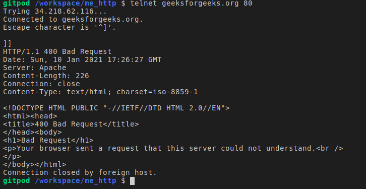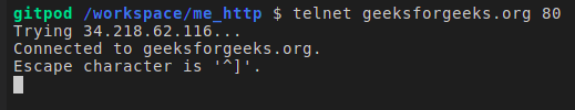 - 现在,让我们通过实际创建一个HTTP请求与响应来了解其组成部分。Telnet客户端可以帮助我们连接到互联网上的其他计算机。其格式如下:Telnet, 主机名,以及港口.