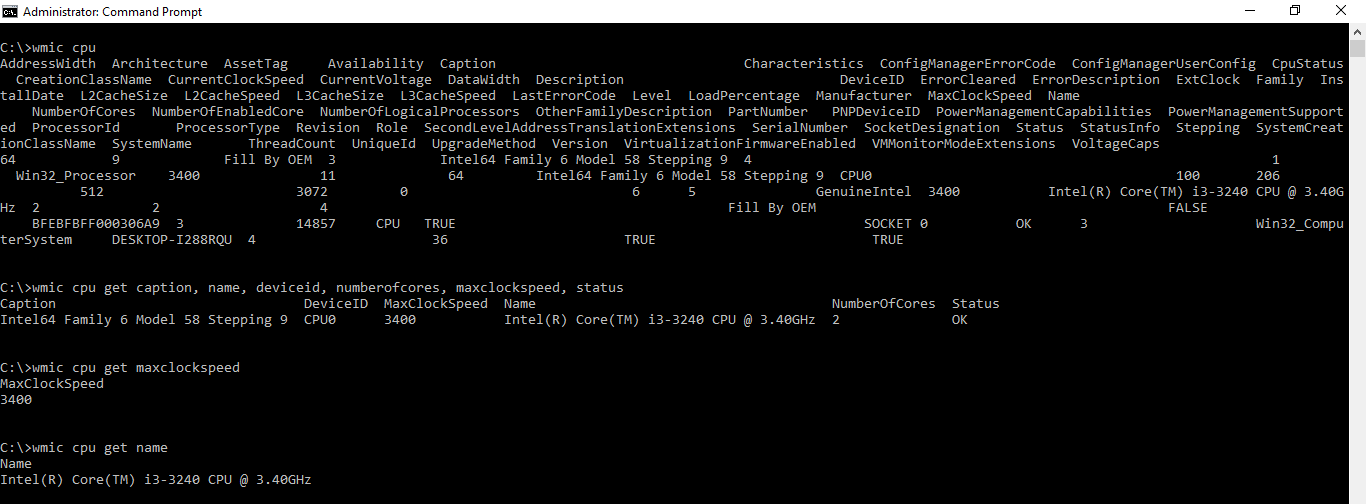 此命令有助于收集有关CPU的所有信息,包括其名称、设备ID、核心数量、最大时钟频率以及状态等。这些信息对于我们了解CPU的规格也非常有帮助。