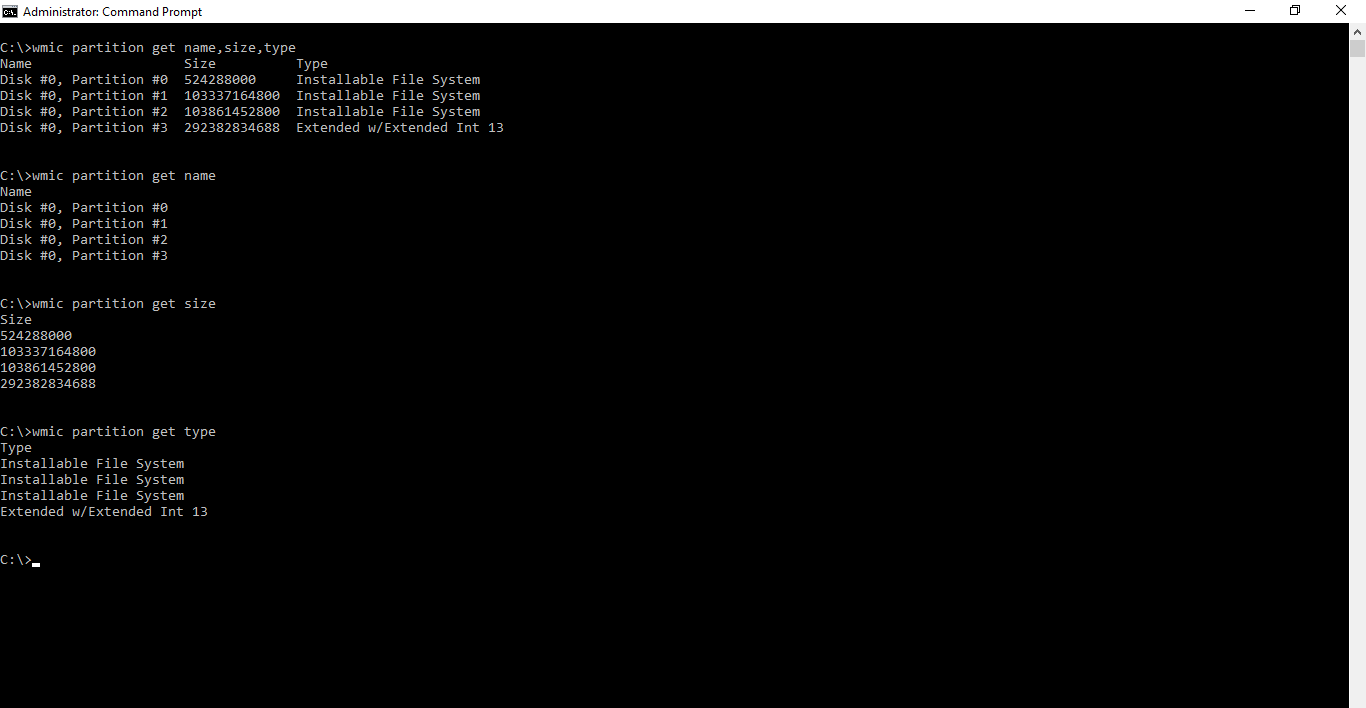 使用 wmic 命令查看分区的名称、大小以及类型。