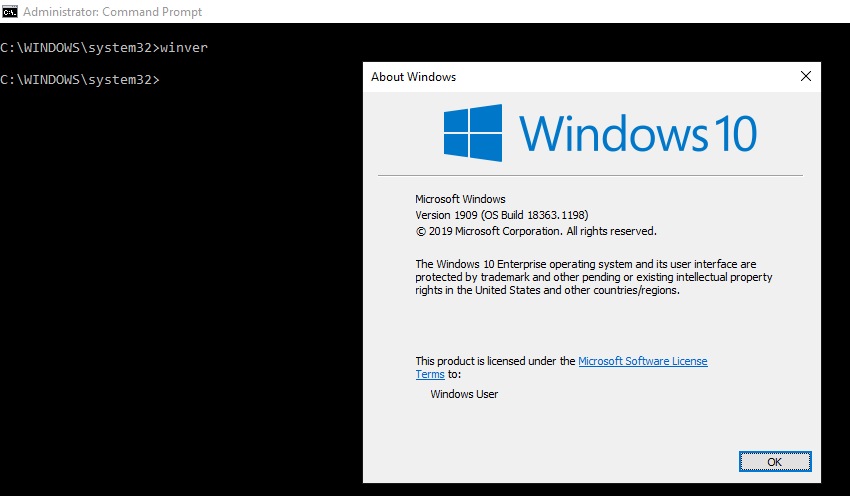 这个命令可以让我们得知窗口的版本信息。这有助于我们了解更新是否已经安装到我们的系统中,以及当前窗口的版本是什么。该命令会弹出一个新的窗口来显示相关信息。关于Windows操作系统在那里,我们可以看到我们的Windows版本。
