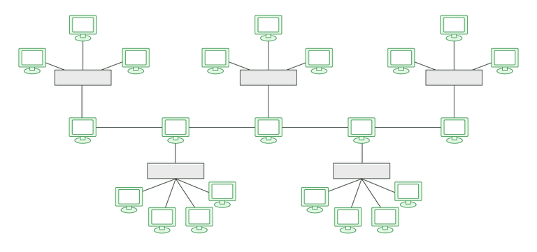 Star Bus Hybrid Topology是一种组合方式。星形拓扑结构以及总线拓扑结构在这里,这些星形网络被连接到总线拓扑结构的电缆上。在下面的图中,你可以清楚地看到星形拓扑和总线拓扑是如何相互连接的,以及它们如何共同构成星形-总线混合拓扑结构。