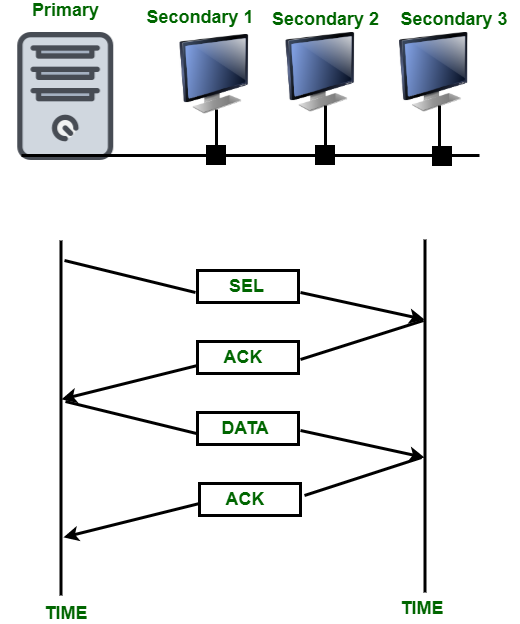 图:polling模式 - (ii). 选择:当主设备想要向任何从设备发送数据时,它会通知该从设备准备接收数据。这个功能被称为“选择”。