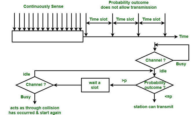 - 如果频道处于空闲状态:那么该电台将以一定的概率发送该帧数据。p然后以一定的概率等待下一个时间段。q = 1 - p。