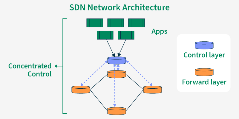 - 集中式控制:它简化了网络的管理工作,因为它为网络管理提供了统一的界面。