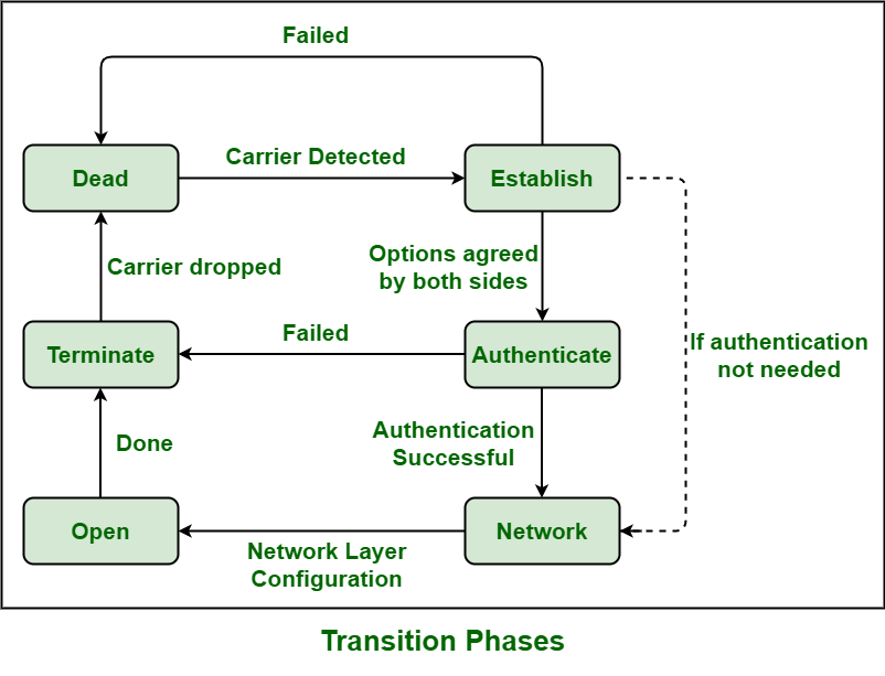 - 死亡了——在这个阶段,链路基本上处于启动和停止的状态。载波检测是一个用于表明物理层已准备好的事件,此时PPP协议将进入建立阶段。如果调制解调器线路断开,那么必须重新连接该线路才能继续进入这个阶段。LCP的自动化处理通常在这个阶段的初期或起始阶段进行。
