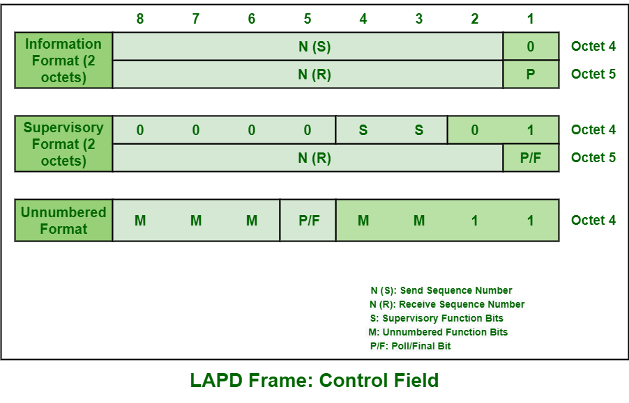 控制领域:该字段通常用于确定正在传输或发送的LAPD帧的类型,同时也会为确认信息传输服务分配序列号。该字段具体用于标识正在传输的消息或帧的类型。它可以分为三种类型:I帧(信息帧)、S帧(监控帧)和U帧(无编号帧)。