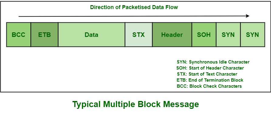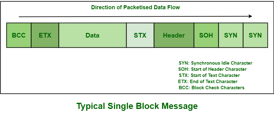 2. 数据框:这些帧实际上是用来承载用户数据的。它们还用于指示数据传输的方向。BISYNC支持两种类型的块消息:单块消息和多块消息。这两种消息之间的唯一区别在于,单块消息的数据结尾会用ETB字符来表示,而不是ETX字符。单块数据框: