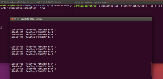 如果发布方客户端不发送任何消息,那么每5秒只会交换PINGREQ和PINGRESP这两个消息。如果订阅方客户端也指定了“keep-alive”时间,那么这些PING消息将由代理服务器与两个客户端分别进行交换,这两个客户端的ID分别为1和2。