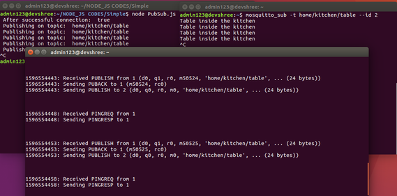 在上述程序中,编号为1的客户端与代理服务器进行连接,该连接的保持时间设置为5秒。 因此,PINGREQ和PINGRESP会在每5秒之间在发布客户端(ID:1)与代理之间交换一次。 另一方面,出版商的客户会每10秒向中介发送一条消息。 该经纪人将从客户编号1处接收“PUBLISH”信息,并发送确认消息,表示所使用的QoS等级为1。 该经纪人还会向订阅者客户端2发送“PUBLISH”指令,这样,订阅者客户端2就可以每10秒接收一次已发布的消息了。输出结果/内容